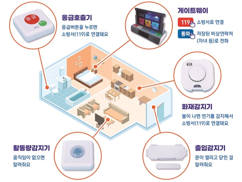 혼자 사는 어르신 댁에 화재, 활동 이상, 출입, 응급 상황 등을 감지하는 기기를 설치하여 비상 상황에 즉시 대처할 수 있는 안심 서비스예요. 기기에 이상이 감지되면 119 및 응급 관리 요원에게 전달되어 빠른 대처가 가능해요.
