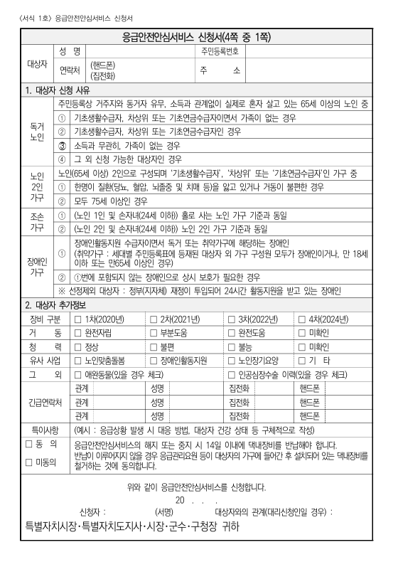 피치 못할 사정으로 부모님 또는 할머니, 할아버지가 혼자 생활하시거나 주변에 마음이 쓰이는 독거 어르신이 있다면 ‘응급 안전 안심 서비스‘를 꼭 주목해 주세요.