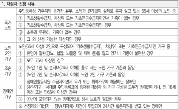 꼭 독거노인이 아니어도 75세 이상 어르신 두 분이서 생활하거나, 배우자가 질병으로 투병하는 노부부, 손자 및 손녀와 생활하는 독거노인이라면 신청할 수 있어요. 그 밖에 장애인으로 등록되신 분도 신청 가능하답니다.