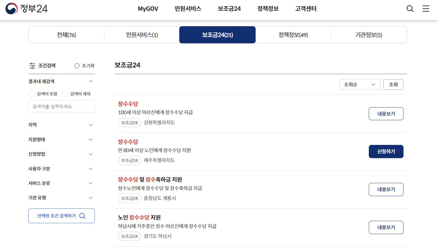 * 운영 지역 확인: 정부 24 홈페이지 (www.gov.kr) 접속 후, 장수수당 검색 → 지역 확인